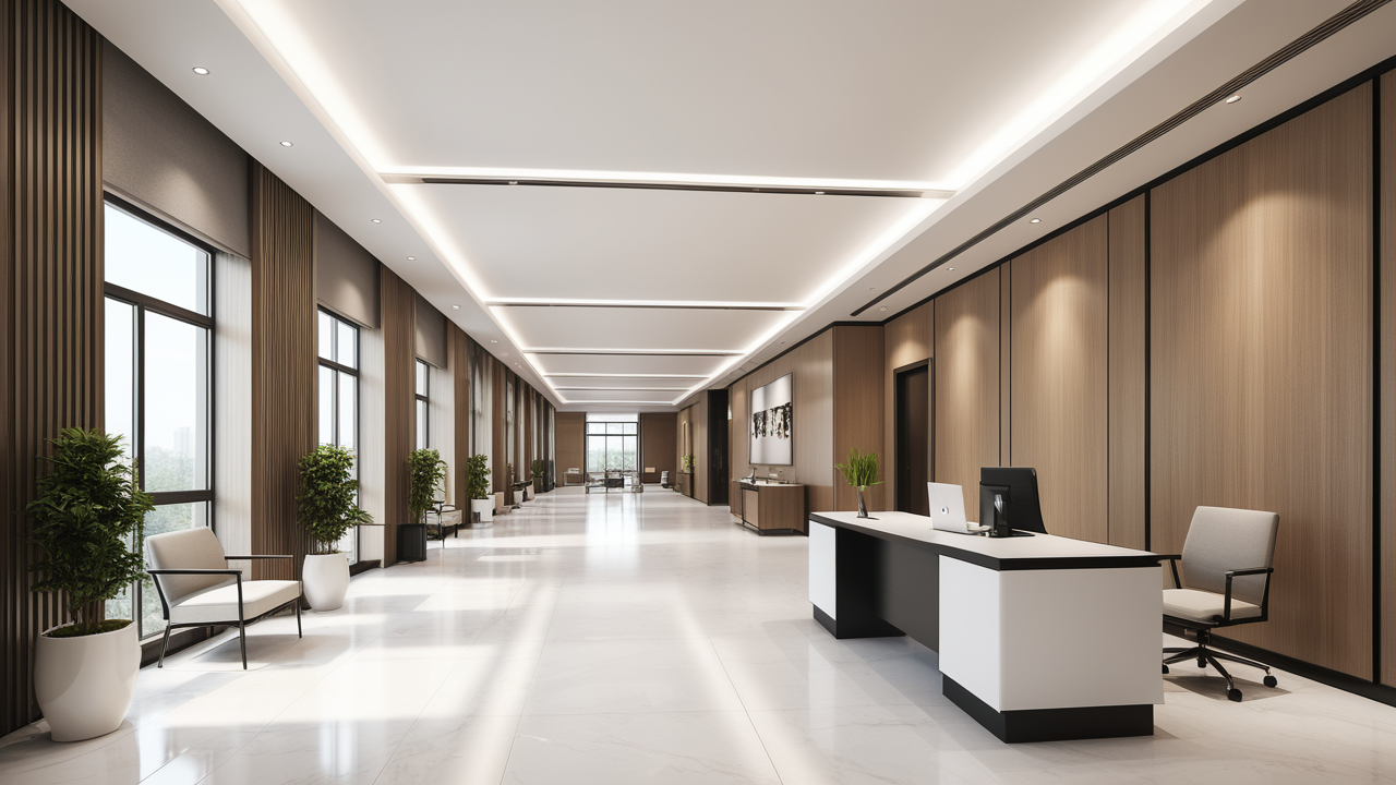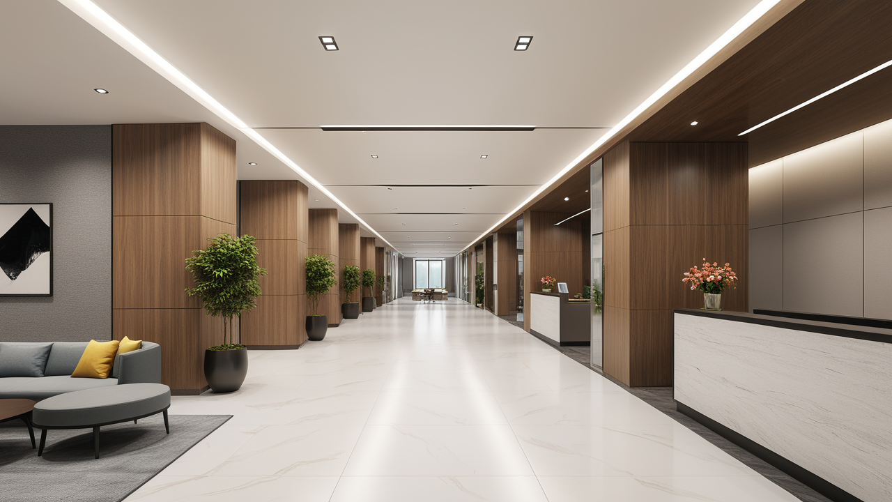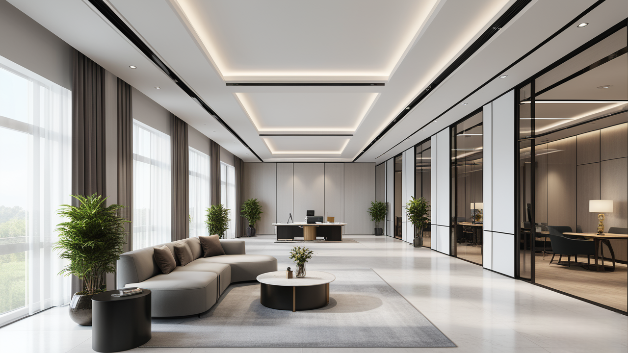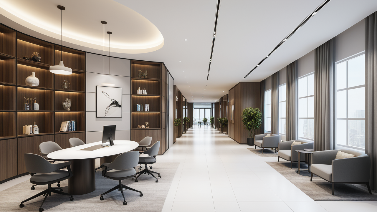 本案圍繞其“靈透”,大量使用了玻璃、銀色系列及淺色調的潔凈材料,如玻璃幕墻、銀質鋁塑板、水晶白麻石材、?;u等,圍繞本案主題,構筑個性化空間,該色彩搭配除了清透、雅致、穩重、大氣之外,亦表現出一種力度感和效率感。滲透入貴機械制造企業之“清透感”,亦反襯企業之“柔美感”。以似乎矛盾的手法,又體現出古人之哲理“剛之極則柔,柔之極則剛”。老子說“上善若水”,該案則就其“善”滲透到每一個空間,極盡讓每個功能區都具有清透之靈性,盡顯靈動、清澈、時尚、大氣之空間氣韻。
