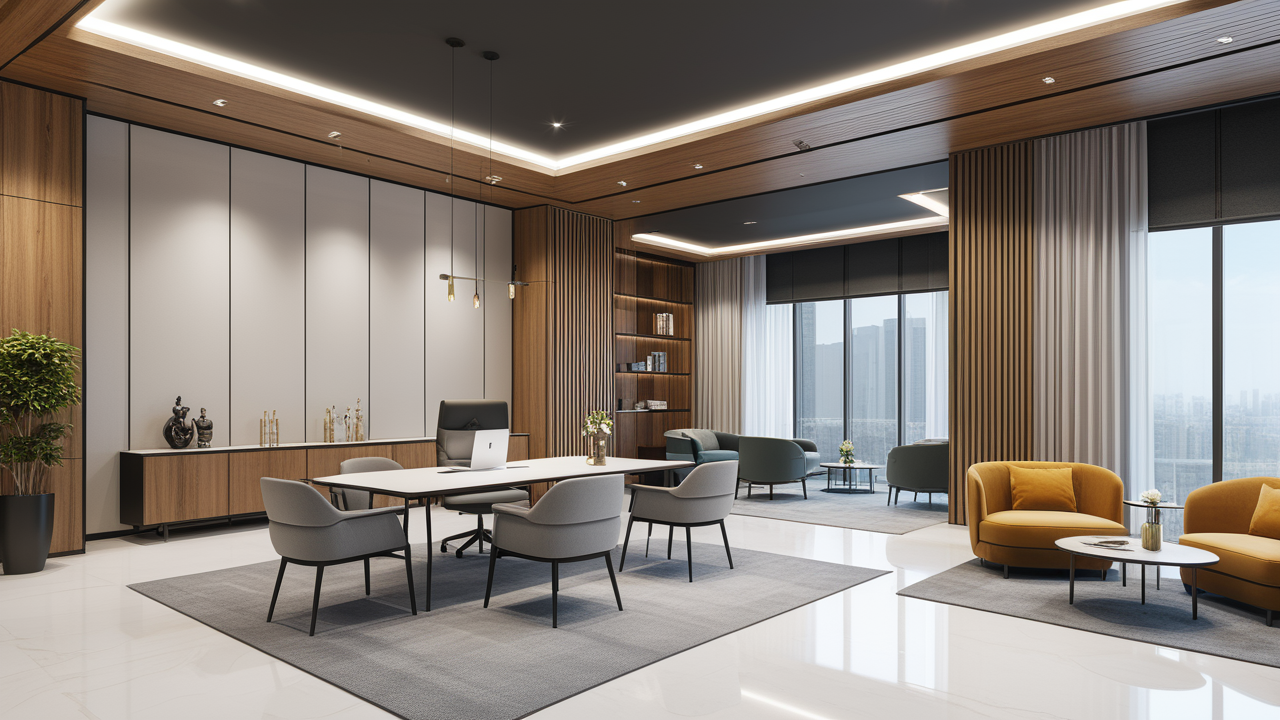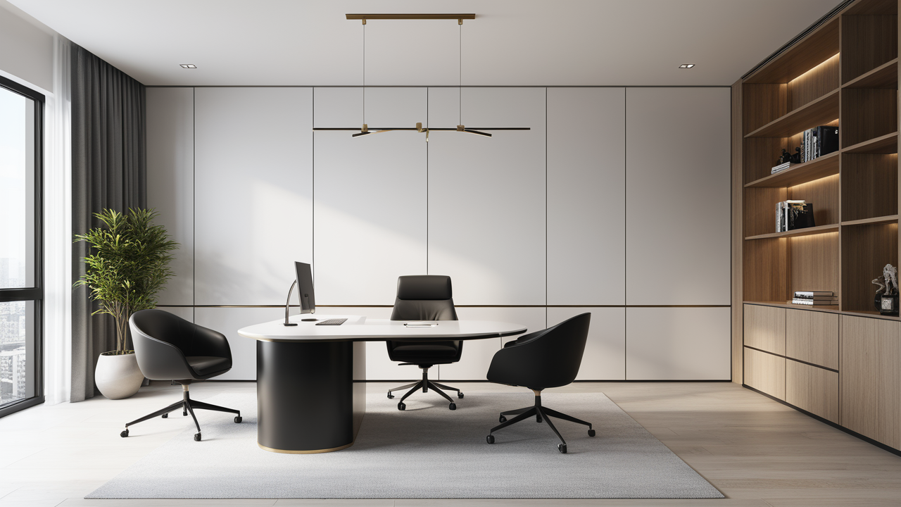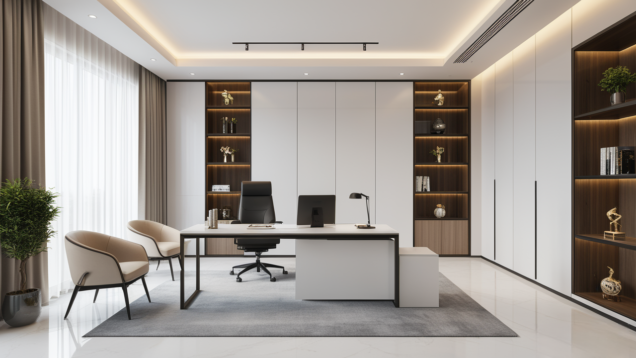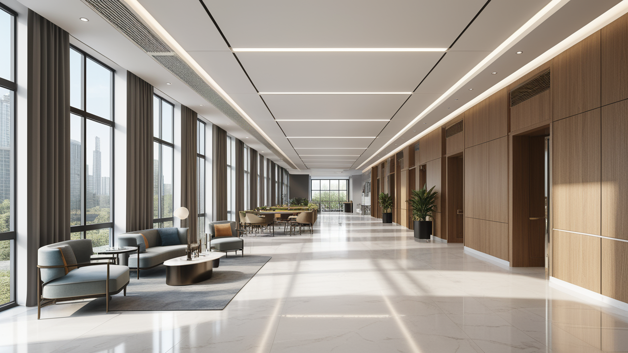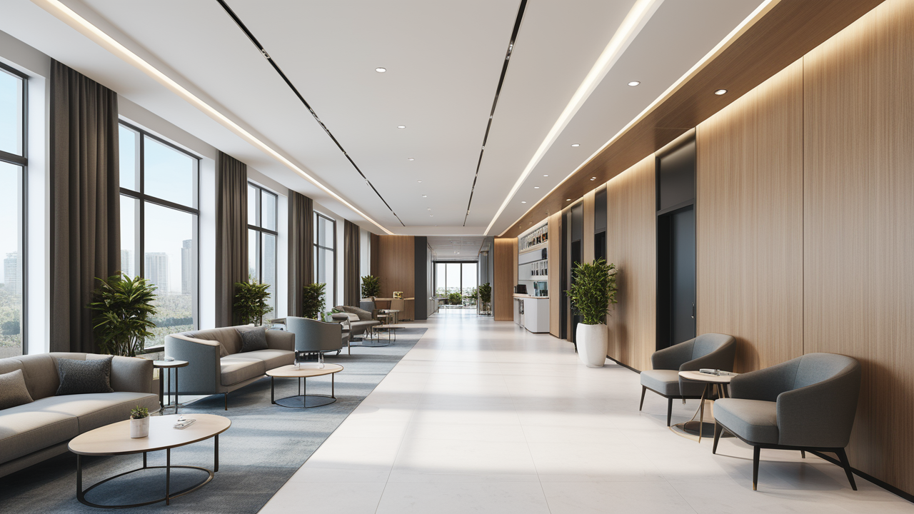 本案圍繞其“靈透”,大量使用了玻璃、銀色系列及淺色調的潔凈材料,如玻璃幕墻、銀質鋁塑板、水晶白麻石材、?;u等,圍繞本案主題,構筑個性化空間,該色彩搭配除了清透、雅致、穩重、大氣之外,亦表現出一種力度感和效率感。滲透入貴機械制造企業之“清透感”,亦反襯企業之“柔美感”。以似乎矛盾的手法,又體現出古人之哲理“剛之極則柔,柔之極則剛”。老子說“上善若水”,該案則就其“善”滲透到每一個空間,極盡讓每個功能區都具有清透之靈性,盡顯靈動、清澈、時尚、大氣之空間氣韻。