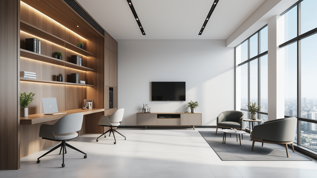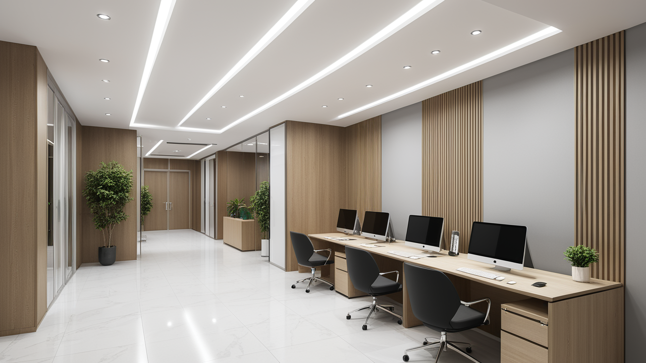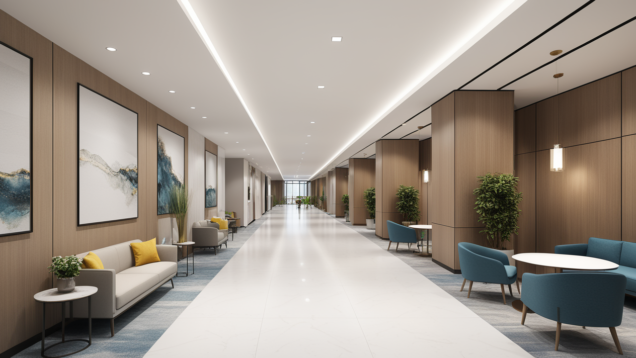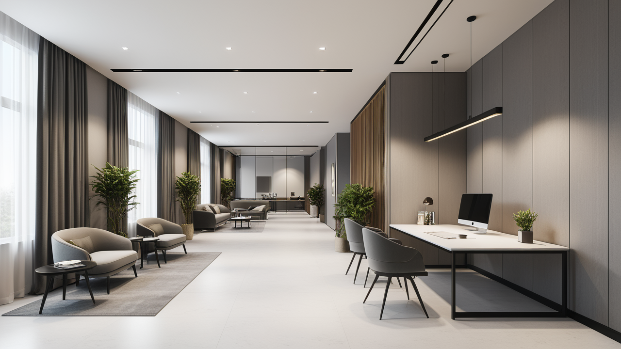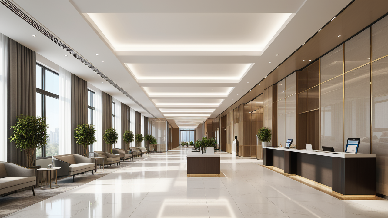本案設(shè)計(jì)中企業(yè)形象墻,以其企業(yè)文化的新興、蓬勃、嚴(yán)謹(jǐn)為主題,兩側(cè)以“居有竹、步步高”的銀色墻柱帶來視覺沖擊感,加上企業(yè)形象色的類比色、淺色石材及不銹鋼條的運(yùn)用,顯示出金屬的質(zhì)感和工業(yè)文明的主題;然而休息區(qū)的陳設(shè)卻明麗蔥郁,充滿人文情感的自然氣息,恰恰彌補(bǔ)了視覺中的剛硬個(gè)冷竣,使人倍感親切。