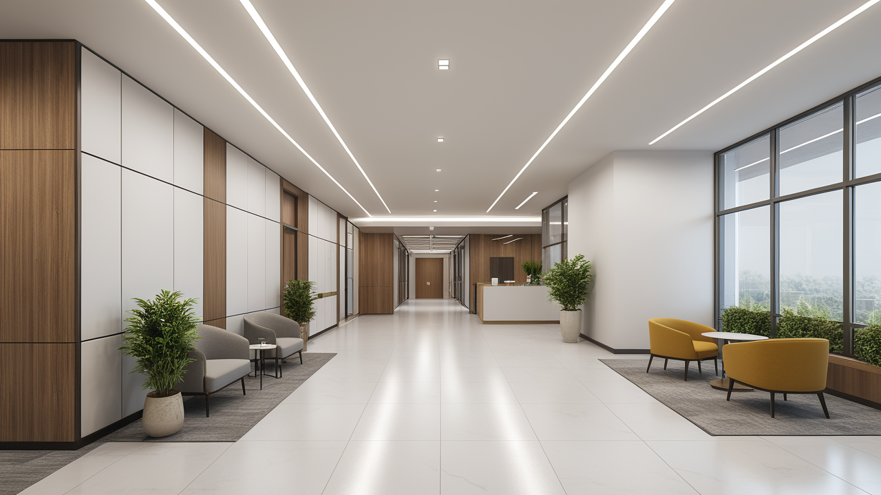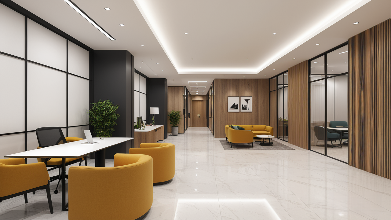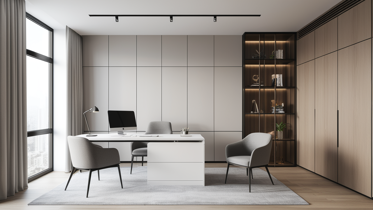 本案在這個辦公室設計中,甲方要求,有功能區設置,有總經理,總經理是本公司中最高的職務,所以在我的設計中給他選擇了一個比較好的朝向,采光比較好、地面采用仿古顯紋復合強化淺色木地板。防滑耐磨。幾何式的辦公桌莊嚴不失人性化。自然的美巧妙的運用到設計之中,突顯對美好生活的向往。放松工作時的狀態,副總經理兩間,裝修風格跟總經理相符,比較統一。會議室,在平面功能上??紤]了合理的行動路線,東面墻對應窗的位置設計了落地的玉砂玻璃隔墻,以滿足展示區的采光要求。