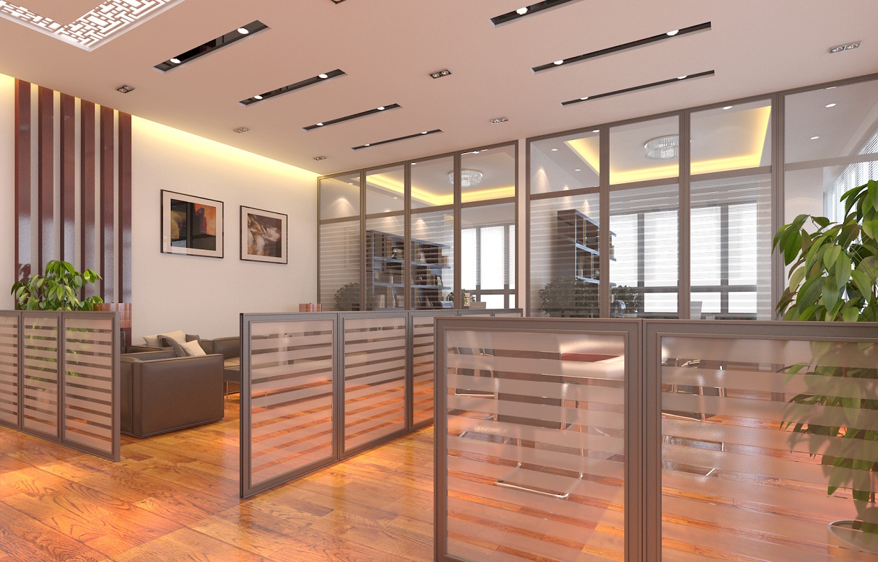 本案設計首先闖入眼簾的是企業形象墻,以其企業文化的新興、蓬勃、嚴謹為主題,兩側以“居有竹、步步高”的銀色墻柱帶來視覺沖擊感,加上企業形象色的類比色、淺色石材及不銹鋼條的運用,顯示出金屬的質感和工業文明的主題;華堂上方呼應以直線為主調、大筆勾勒而出的時尚型弧面吊頂,大直大方顯示出強烈的縱深感,加之以清透、明媚的光色渲染,工整氣派、大家風范,反襯出貴公司辦公樓的現代時尚特性,以干練快捷的設計節奏,展示出質量與效率并舉的時代精神。