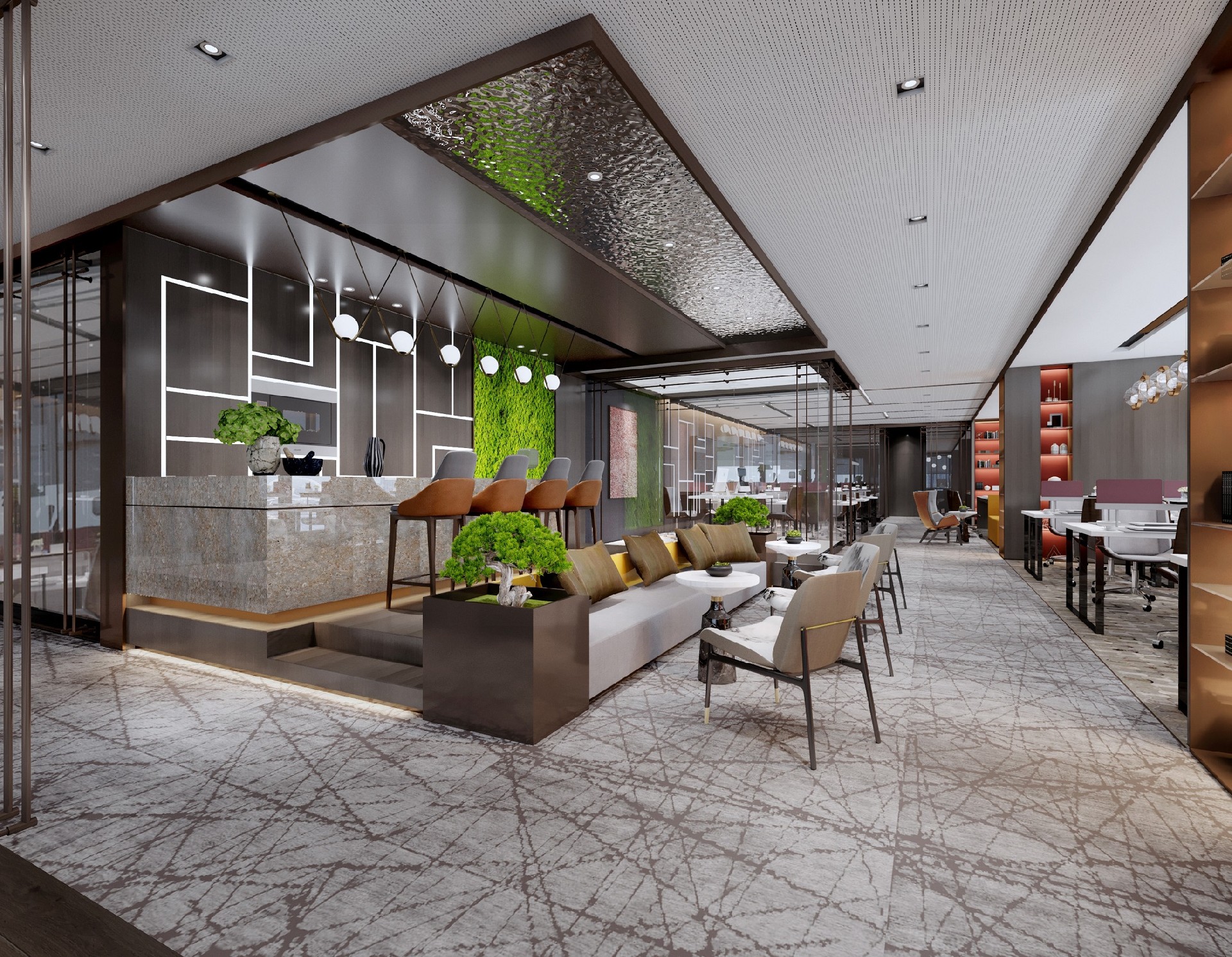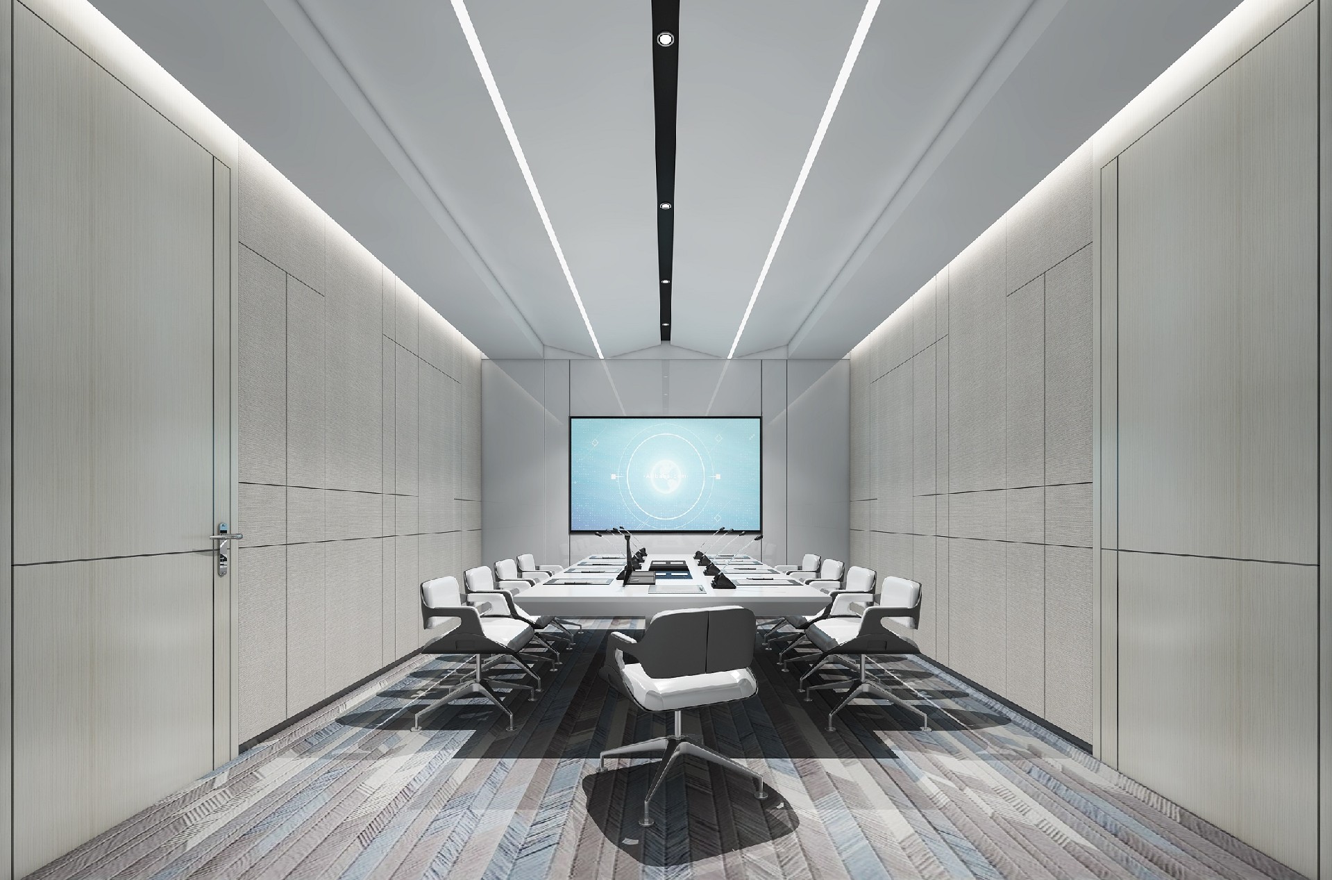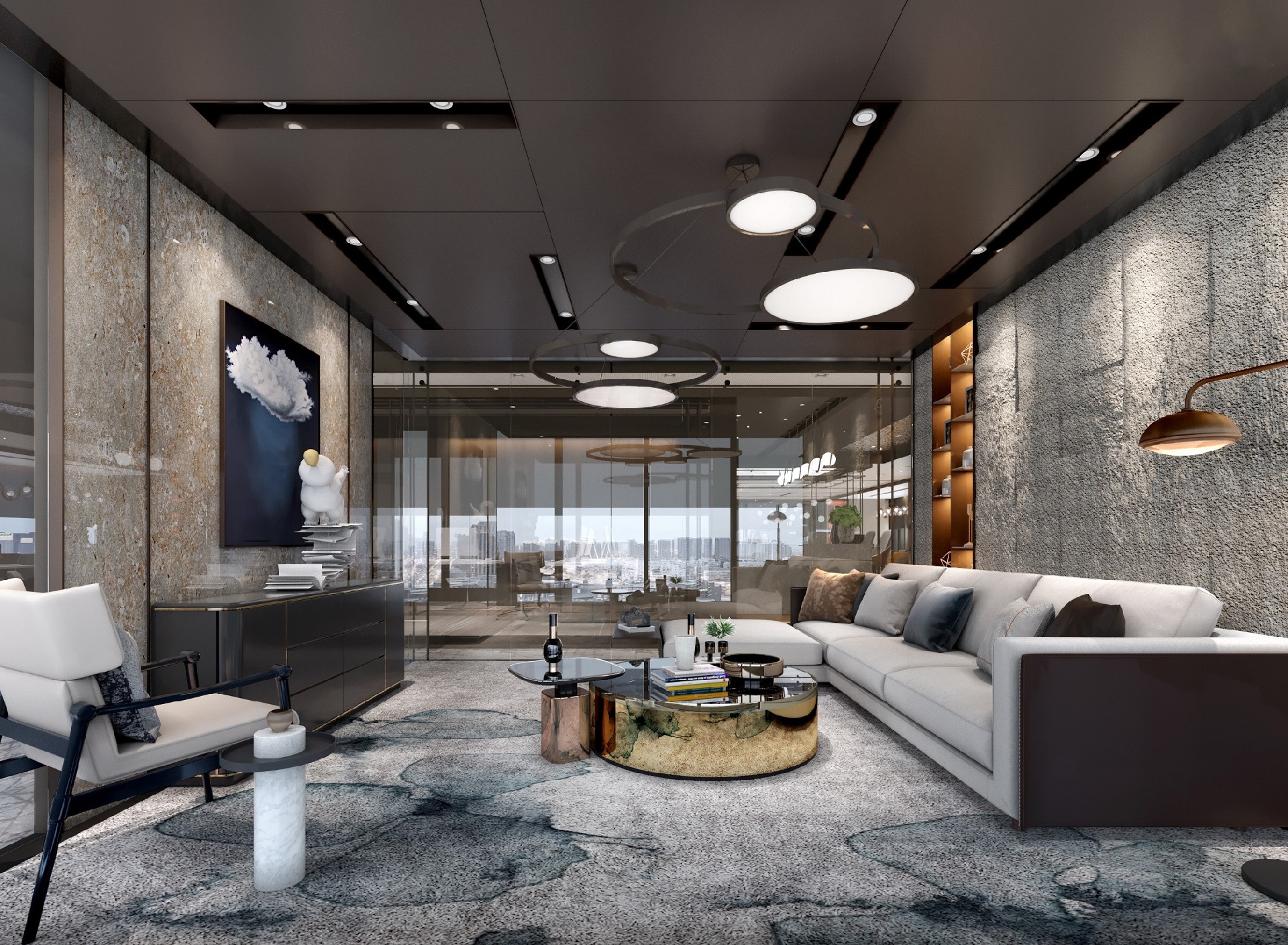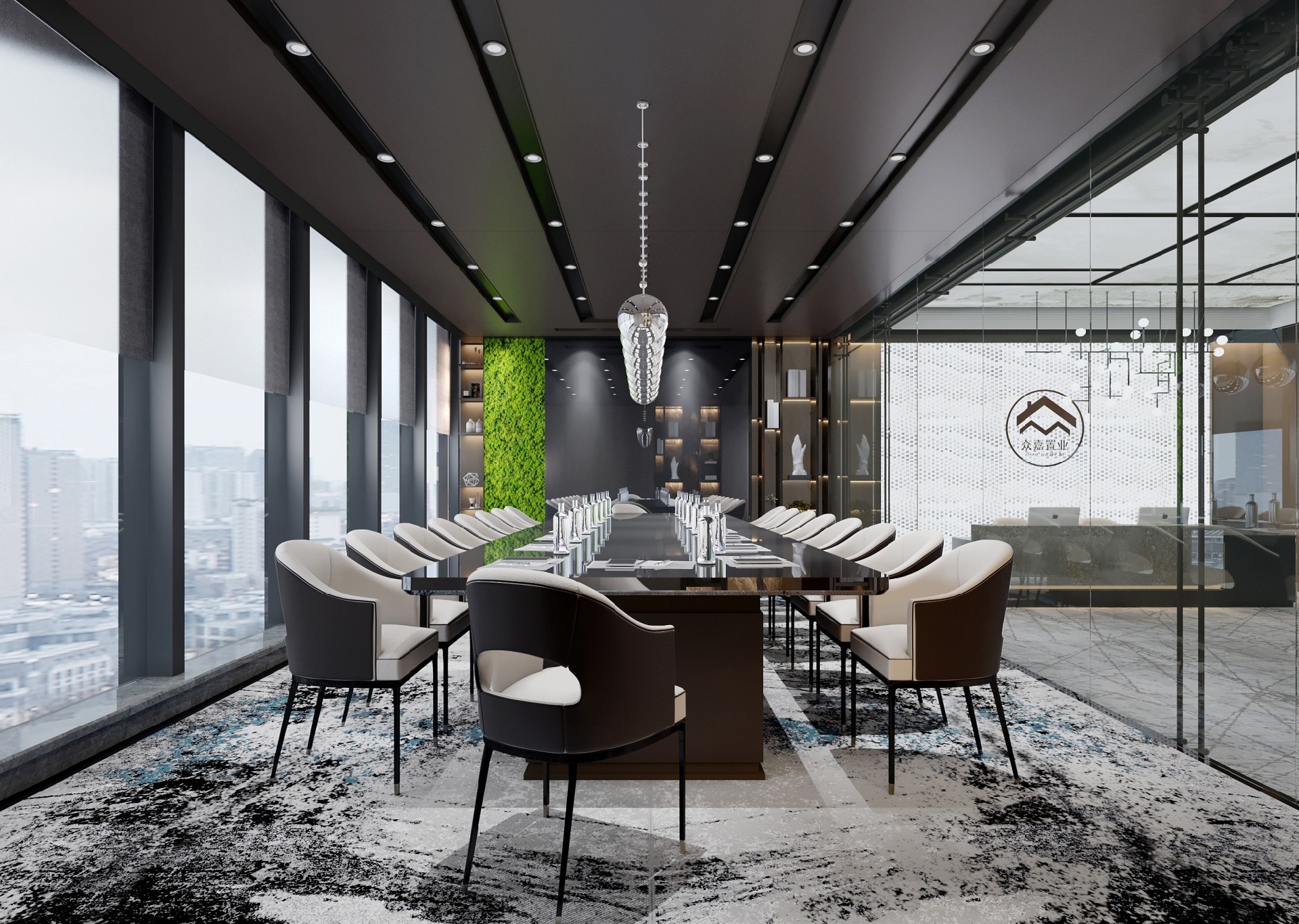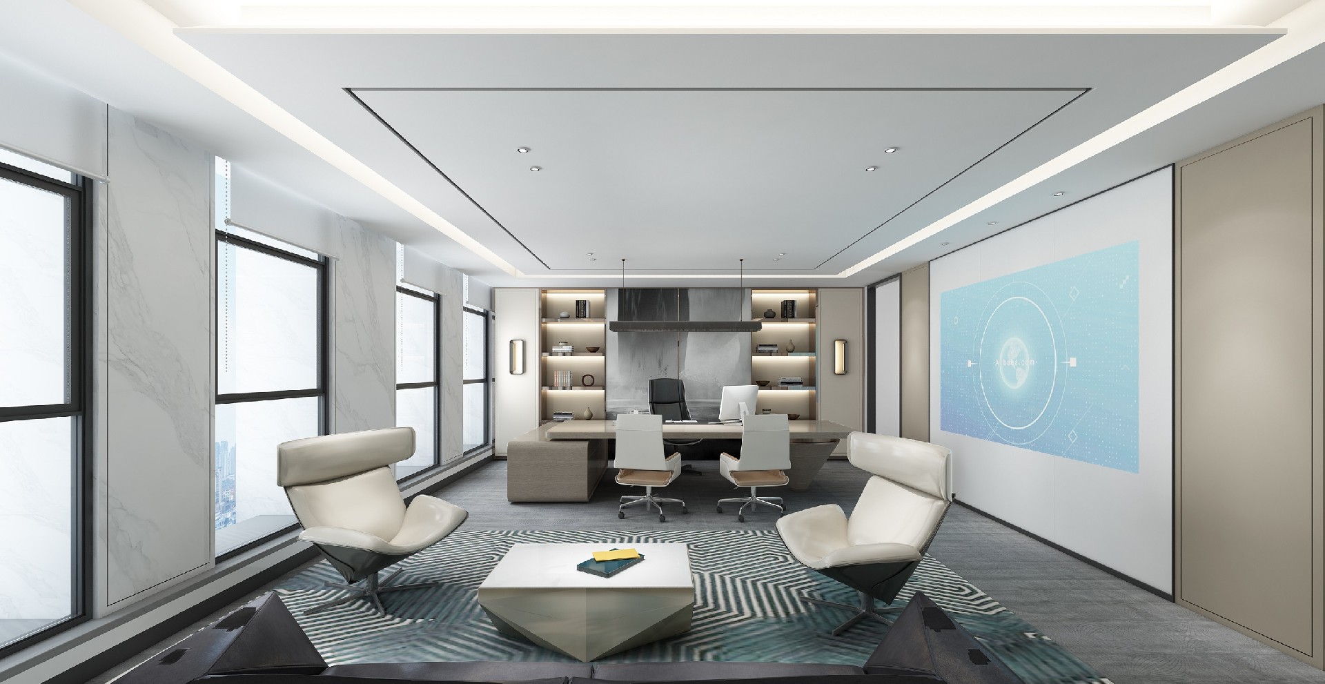 本案在這個辦公室設計中,甲方要求,有功能區設置,有總經理,總經理是本公司中最高的職務,所以在我的設計中給他選擇了一個比較好的朝向,采光比較好、地面采用仿古顯紋復合強化淺色木地板。防滑耐磨。幾何式的辦公桌莊嚴不失人性化。自然的美巧妙的運用到設計之中,突顯對美好生活的向往。放松工作時的狀態,副總經理兩間,裝修風格跟總經理相符,比較統一。會議室,在平面功能上。考慮了合理的行動路線,東面墻對應窗的位置設計了落地的玉砂玻璃隔墻,以滿足展示區的采光要求。