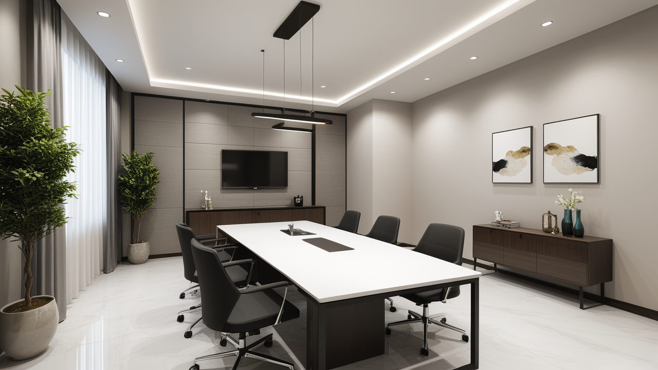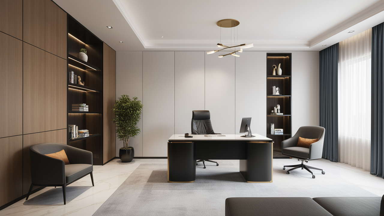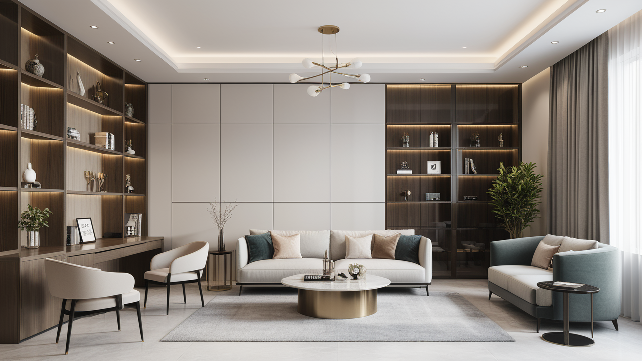 本案設計在處理上,特設計了可向客戶展示企業榮譽品的展示墻,用料實際,無須雕琢張揚,直線條的造型讓整個空間顯得穩重大方,淺色系材料的運用延續了靈動而清澈的氣韻,大方莊重卻內含現代時尚。而且色調淡雅的地毯、沙發、背景,還突出了接待廳親切、和睦、寬松的氛圍,使穩靜而坦誠的晤談氣氛盎然一室。