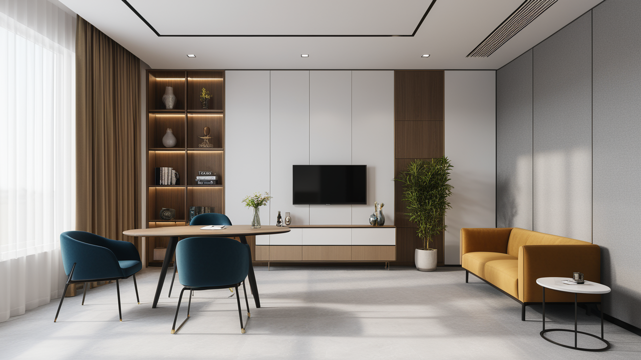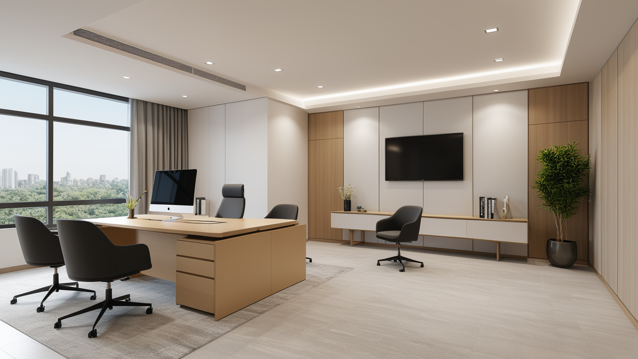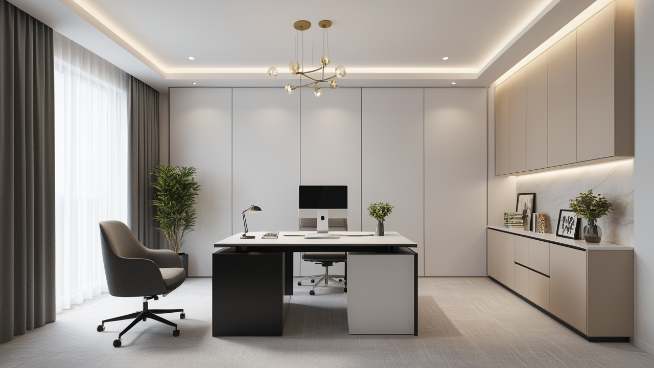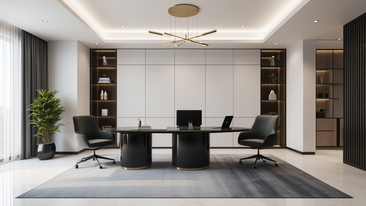本案設計在處理上,特設計了可向客戶展示企業榮譽品的展示墻,用料實際,無須雕琢張揚,直線條的造型讓整個空間顯得穩重大方,淺色系材料的運用延續了靈動而清澈的氣韻,大方莊重卻內含現代時尚。而且色調淡雅的地毯、沙發、背景,還突出了接待廳親切、和睦、寬松的氛圍,使穩靜而坦誠的晤談氣氛盎然一室。
